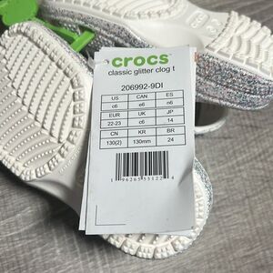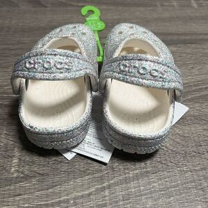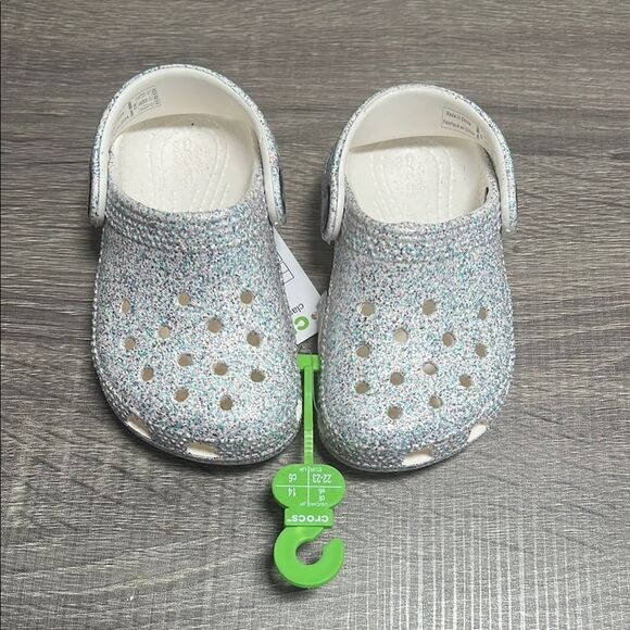 Comfortable and stylish Crocs clogs for kids. Featuring a fun multicolor glitter design, perfect for everyday wear.