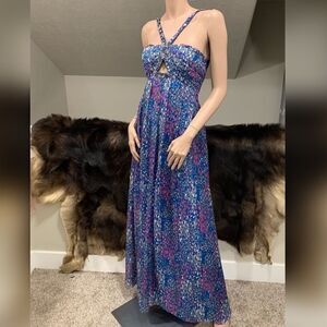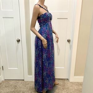 This beautiful floral dress is of great quality. A high quality sample of an exquisitely beaded dress. Cross straps on the back. Multi-color and multi-shaped precision hand beaded. Full length. padded bra. Hidden side zipper. Fully lined. This chiffon fabric is ultra-thin, light and elegant, feels as silky and soft as silk, but not easy to wrinkle. 100% polyester.