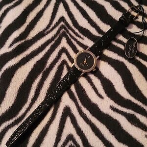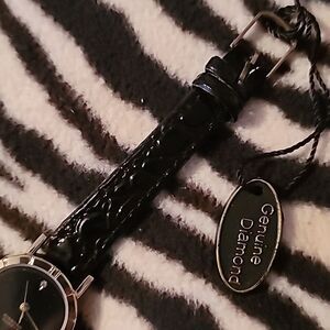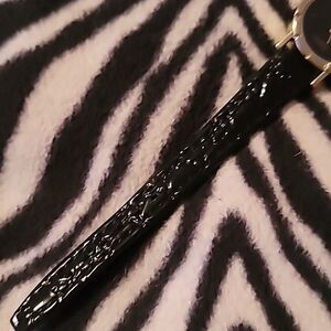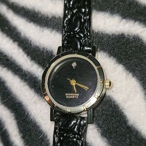 New Diamond Quartz Ladies Watch Wristwatch Analog Black Patent Band Gold Case