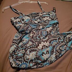 Abstract print maxi dress in a blue, white and brown mixed print. Has a layered flap bust detail. Integrated bra. Spaghetti straps. It's new with tags.