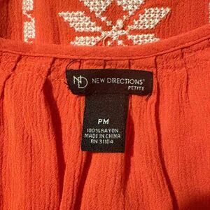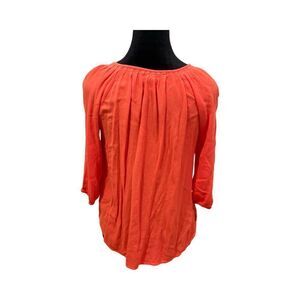 Pretty coral colored top featuring white emroidery stitches on the front. Comfortable, flowy top with 3/4 sleeves with elastic cuff. Round neck featuring a key hole with button at the top. The top is in good used condition; no stained or damaged fabric. Size Petite M.