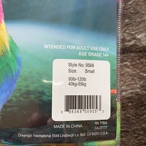 Dance and party in neon brights with this Candy Rainbow Party Fairy costume that features a strapless pink and green corset sequin dress, a multi-layered colorful tutu skirt, and a pair of colorful wings. Wig, stockings, boot covers, jewelry, and wand not included. Dreamgirl 9566.