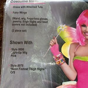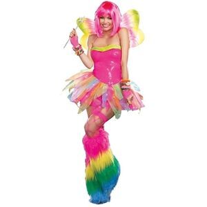 Dance and party in neon brights with this Candy Rainbow Party Fairy costume that features a strapless pink and green corset sequin dress, a multi-layered colorful tutu skirt, and a pair of colorful wings. Wig, stockings, boot covers, jewelry, and wand not included. Dreamgirl 9566.