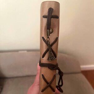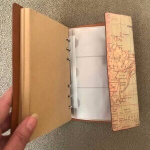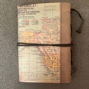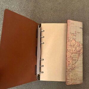 Paris Eiffel Tower Travel Journal with brown/ tan pages. No lines so can be used for journaling, drawing, or for pictires, etc. It has sleeves to hold business cards in the back. A wrap around closure and a Eiffel Tower charm. New- never used.