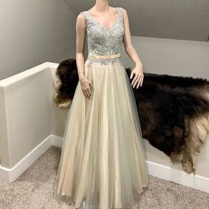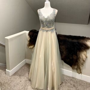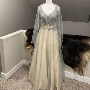 Great quality. Romantic embroidered floral lace with shiny beads, Includes extra tulle shawl. The fitted bodice is a lovely complement to the flowing fabric.
