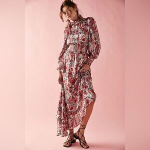 Printed to perfection, this gorgoeus maxi dress is featured in a femme, floral design. Detailed with ruffle and exaggerated sleeves, and smocked waistband for added shape.