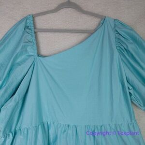 Gorgeous baby blue shiny Asymmetrical neck with one shoulder that can be worn off the shoulder, tiered trapeze mini dress from Eloquii! Perfect for spring like a reimagined Cinderella!!