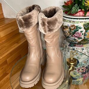 Step out in these eye-catching boots featured in a mid-calf height and slouchy silhouette with a cozy fur collar, dreamy lined interior, and chunky lugged sole.