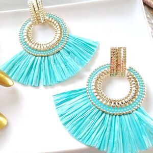 These Stunning FP Amber Aqua Raffia Post Back Dangle Earrings. A Must-Have Elegant & Beautiful Earrings. Features Gold Hardware & Aqua Blue Raffia With Push Backs