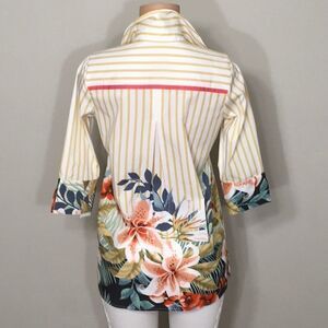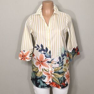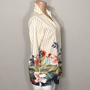 Beautiful stripes and floral tunic top. This brand runs large so a small could wear a extra small. The fabric has stretch in it so it makes it very comfortable. The fabric is nice quality.