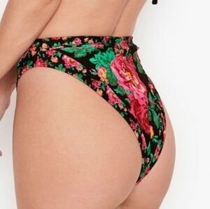Vibrant floral bikini set with a bow detail. Features a mix of pink, green, and black colors.