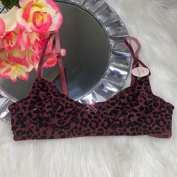 New with tags attached forever 21 Leopard print underwire bra. Features sheer mesh in maroon or deep plum color with raised leopard print in black velvet. Has small velvet bow in center and Thin velvet straps in a lighter plum color. traditional eye and hook adjustable fasteners. Sexy, bold and fun! Size 32A