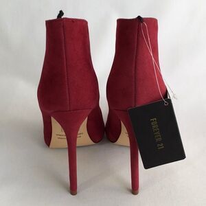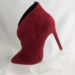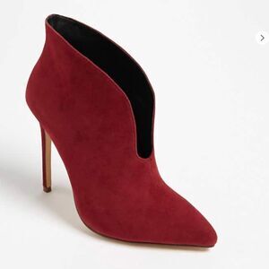 A pair of faux suede booties featuring a front cutout, pointed toe, and stiletto heel.