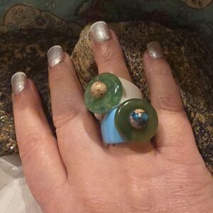 Featuring layered circular accents in vibrant green, blue, and ivory tones with contrasting center details, this ring adds a playful pop of color and sculptural flair to any look.