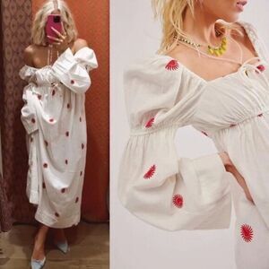 New! Free People Floral Emory Embroidered Sun Midi Dress white red, size S