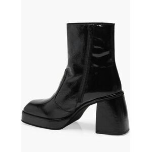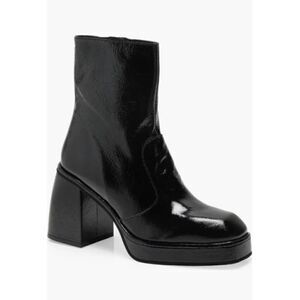 A patent finish really makes this platform boot shine while lifted on a slightly flared block heel.3 1/2" heel6" shaftLeather upper and lining/rubber soleMade in Spain
