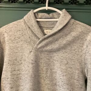Super soft, gray cotton/poly sweater, medium weight, with classic shawl collar design. Size XS.