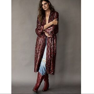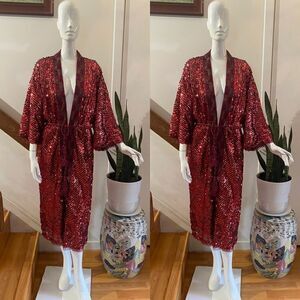 Dressed up or dressed down, shine bright in this gorgeous sequin embellished duster featuring floral trim embroidery and a tassel-accented waist tie.