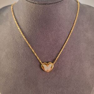 New gold over stainless steel sparkle butterfly heart pendant necklace. Pendant is featured on a 16"- 18" cable chain. The piece was photographed in different light.