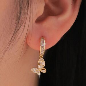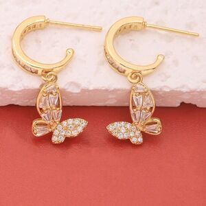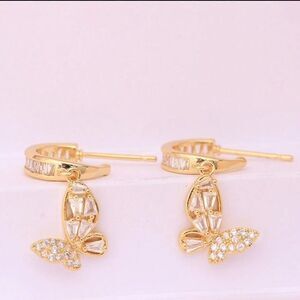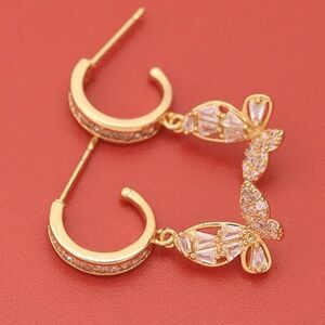 New Gorgeous 18k Gold Plated Cubic Zirconia Huggie Hoop Butterfly Drop Earrings