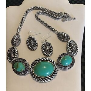 This pretty necklace and earring set looks just as great with a tank top and jeans as it does with business or formal attire. It is done in a heavy sterling silver plate and rhodium finish. The oval discs have simulated turquoise as well as paisley and textured rope designs. The braided rope design chain is 18” in length with a 3” chain extender and lobster claw clasp closure. The matching earrings are 2” in length with ear wire hook closures.