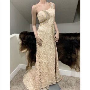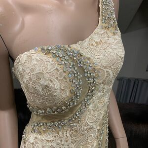 Extremely high quality gown, very elegant and sexy. Exquisite embroidery lace and mesh fabric with shiny rhinestone beads and sequins. This gown is so striking with its one shoulder neckline. There is a slit in the front. All beading done by hand.