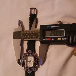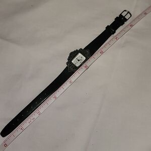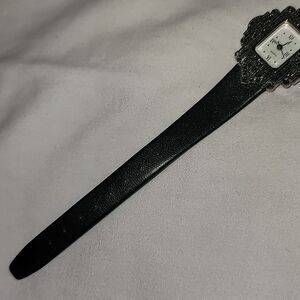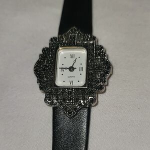 New Gothic Avon Silvertone Marcasite Watch Black Leather Band Goth Romantic