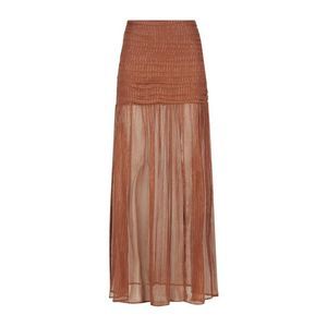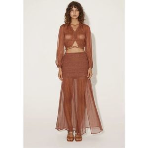 The Brynn is a heavily gathered, high waisted maxi skirt cut in a Cocoa coloured silk with a Metallic thread. With added volume at the hem of the skirt, this allows for a relaxed comfortable fit. Pair back with the Lyla Top for a matching set.