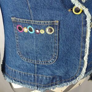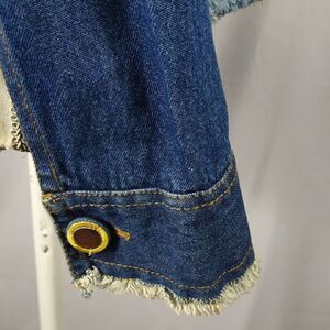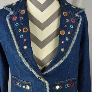 This blue jean embellished New Identity jacket is a size Medium with a pit to pit measurement of 19" and a length of 21". It has distressed collar and cuffs. Two front embellished pockets. One button closure. 100% cotton and hand washable. Pre-owned and in excellent condition. All offers welcome.