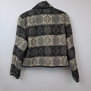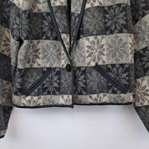 In Excellent condition! Shades of gray and black, size small. Shawl collar, 1 button front, unlined, 2 front welt pockets. Measures 21" pit to pit, length is 21".