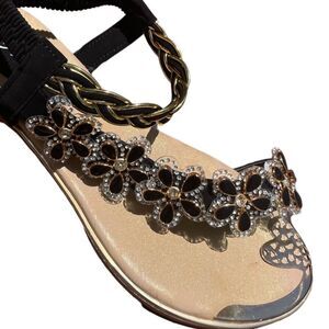 This thong sandal is great to dress up, or dress down; day to night. The soft elastic slingback keeps your foot secure & comfortable. This sandal is embellished w/ white flowers, silver rhinestones, a gold plated design at inner toes & a gold braid. The insole is purposefully brushed w/ metallic gold strokes. All materials are faux leather & this sandal runs true to size Italina / Atalina by Summer Rio Floral Rhinestone Thong Flat Sandal