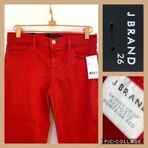 New with tags beautiful J Brand crop capris retro style Pompeian red skinny jeans. 26” waist. These have a rockabilly aesthetic would be excellent to wear to a classic car show. Red is a power color! Measurements are in the photos Msrp $178 sells at stores such as Bloomingdales and Nordstrom’s.