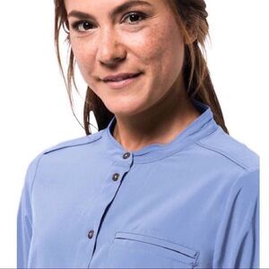 Jack Wolfskin blue Victoria button down collarless top with overall stretch and one breast pocket. Armpit-to-armpit 27”, sleeve 26” and length 32”. Brand new with tags attached.