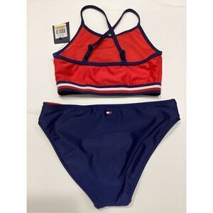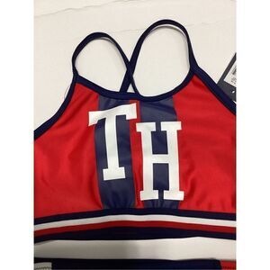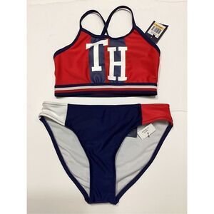 New. Kids Tommy Hilfiger flag bikini. S-top/M-bottom. Mixed sizes. A Hilfiger signature red, white and blue colors. This kid’s bikini is adorable! The iconic TH symbol on the top. And the color black bottoms are perfect together. This suit is high quality fabric fully lined. Elastic band on the top.