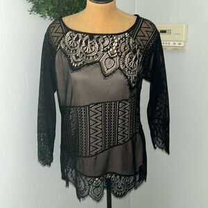 Sheer sleeves. Scalloped lace bottom. Nude underlying. Armpit to armpit 21, length 27.