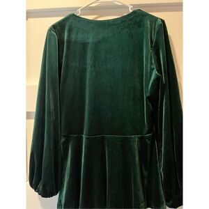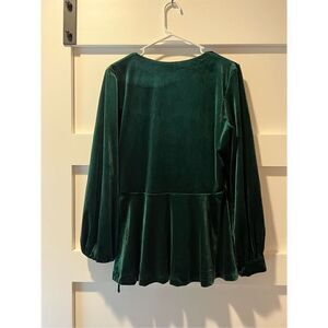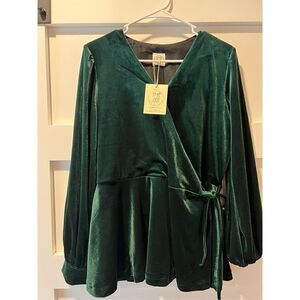 New with tags. Beautiful velvet green top. Snap closure and wrap style top. Puffed sleeves with elastic cuff. Size M. Wrap tie style. Approx measurements across chest 18” waist 16” length 26.5”