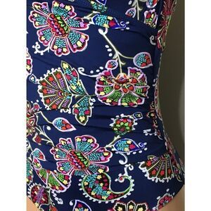 New. Liz Claiborne navy floral swimsuit. This has a beautiful bright floral pattern on it. Crosses in the front for a faux wrap with rushing on the side. Great tummy control. This runs more like a size 4. Considered full coverage bottom. This Liz Claiborne one piece has colors of navy, dark red, pink, purple, white, and green. It’s absolutely gorgeous. V-neck halter style and tie at the neck. Soft removable pads. High-quality fabric. Hygienic liner intact. Partial tag. It has been cut.