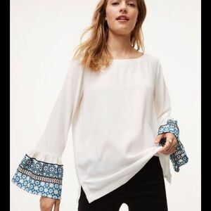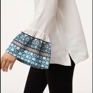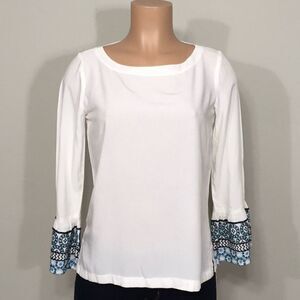 Beautiful pull over style top. Turquoise and black and blue embroidered sleeves. #0041194