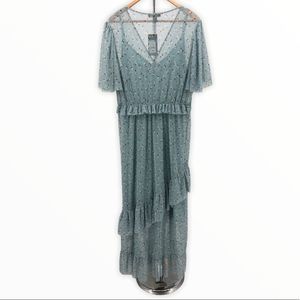 Flattering and feminine dress, with light layers of mesh and asymmetrical ruffle detailing, surplice neckline, elastic at waist, short flutter sleeves, attached solid slip, both fabrics have a good amount of stretch to them. Purchased from ASOS.