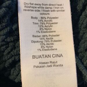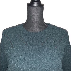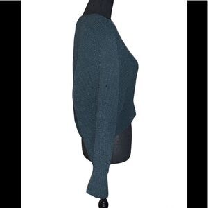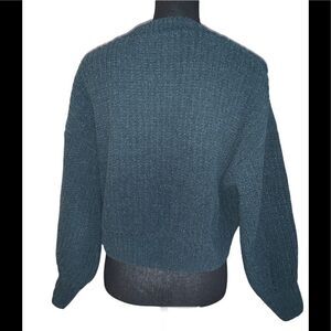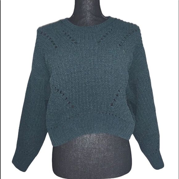 Pine green cropped sweater. Long sleeve. Crewneck. Body: 86% polyester/14% acrylic. Trim: 79% polyester/112% acrylic/8% nylon/1% elastodiene. Size: small. Preowned in good condition.