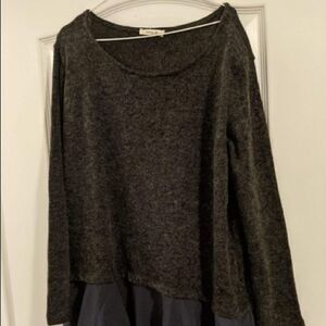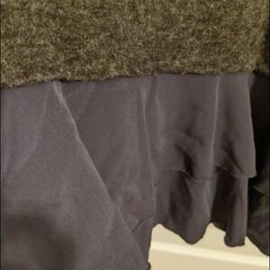 New without tags. Never worn. Purchased at local boutique. Gray top with navy blue ruffle. Tunic style or short dress. Approx measurements pit to pit 21” length 32”