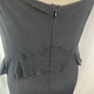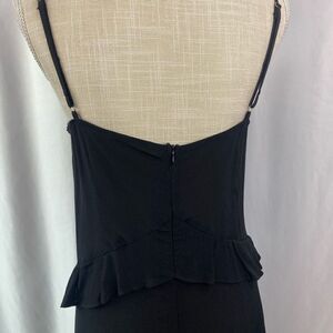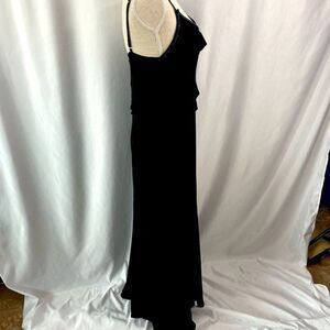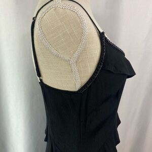 Black Maxi beaded crepe dress ruffled right at the waist. The spaghetti straps are adjustable and it has a zipper at the side.