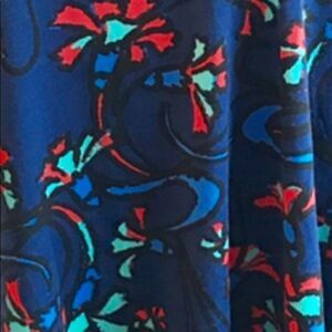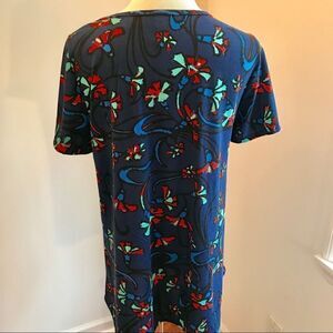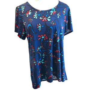 NWOT LuLaRoe Irma short sleeve t-shirt in red, blue and green floral design, round neck and over all stretch. Armpit-to-armpit 22”, sleeve 9” and length 29”. Brand new with no tags attached.