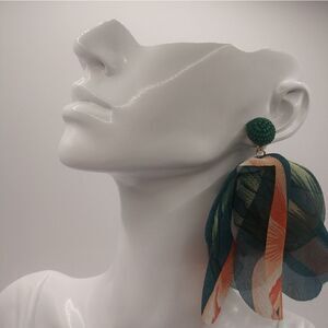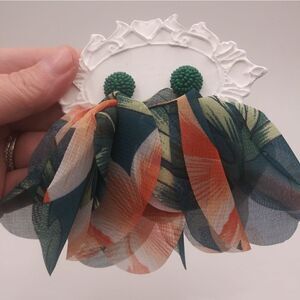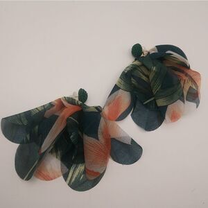 New without tags, these Lulu's tropical fabric earrings are ready for vacation season. Gorgeous dark green and salmon pink fabric. Post backs are lead and nickel free. Measures 2.1cm x 9cm. Comes in a jewelry pouch with extra backs.