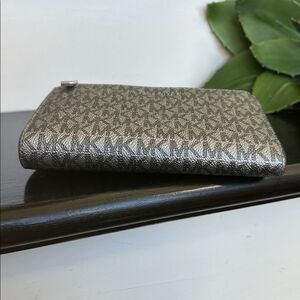 This brand-new Michael Kors wristlet clutch wallet is both stylish and functional — the perfect grab-and-go accessory for any occasion. Crafted from durable coated canvas in the signature MK monogram print with sleek gray leather trim, it features polished silver-tone hardware that adds a touch of luxury.
