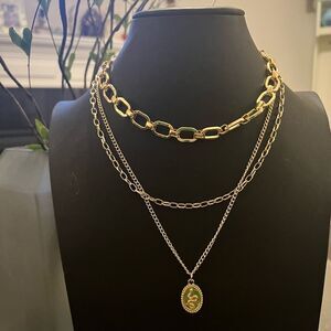 This is a beautiful and trendy multi layered necklace that consists of varying with of Chains. Each one compliments the others very well, and the center, longest necklace holds a pendant with a curvy snake on it. It’s very close to the Kate Spade snake without color.