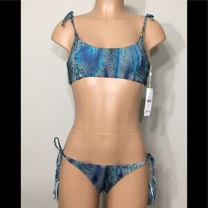 New. Beautiful python print and multi colors of blue green black teal a little bit of copper. It’s gorgeous! The top is pull on style the straps adjust with ties. It’s fully reversible. The bottoms have side ties and is considered a full cut. Fully reversible