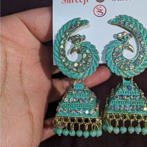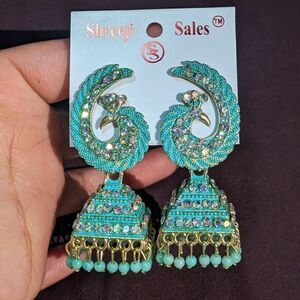 New! Peacock sparkley blue clear stone stud jhumka earrings medium size light weight made in India great for any occasion party wedding bridal.
