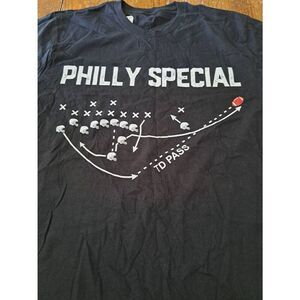 Brand new with printer's label decal still attached. Never worn. Men's size large "Philly Special" football-themed short sleeve t-shirt in black with white and brown detailing. Made of 100% cotton. Classic crew neck pullover style.