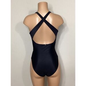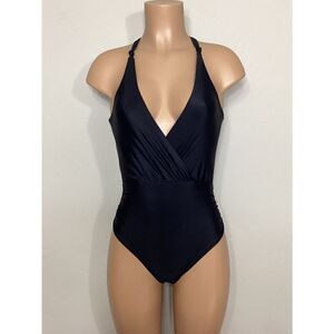 New. Pilyq black plunge neck one piece. Crossover front. Knotted detail on straps. Gold badge on back. Halter style. Straps criss cross in back. Fully lined. High quality buttery soft fabric. Suit has a nice stretch to it. This is a sample style and the tag has hand writing on it like all samples. Says small and it fits manikin like a small. This is very pretty!